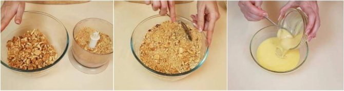 Начинаем с крошки печенья: половину измельчаем блендером, другую часть ломаем руками на маленькие частички.