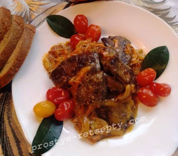 печень говяжья — 500 г сметана — 300 г лук — 2 головки соль, перец — по вкусу масло подсолнечное — для жарки