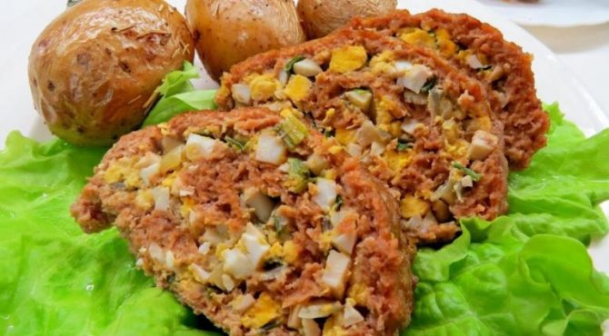 - Заворачиваем края фольги, формируя рулет. Оборачиваем рулет фольгой и отправляем в духовку на час. За 10 минут до готовности разрываем фольгу, чтобы рулет подрумянился. Готовое блюдо нарезаем порционными кусочками и подаем к столу.