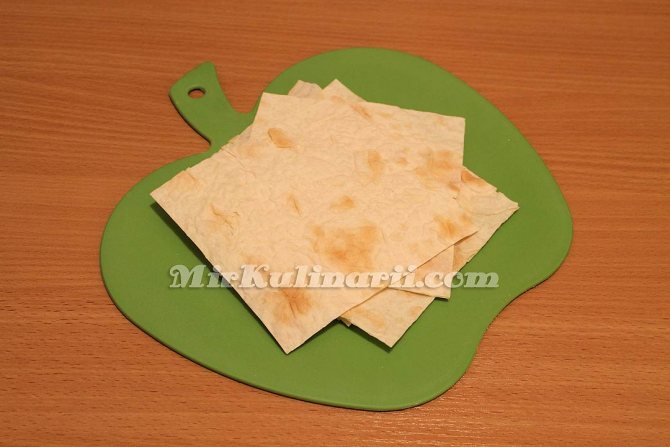 - Разрежьте лаваш на небольшие квадратики – примерно 10х10 см.