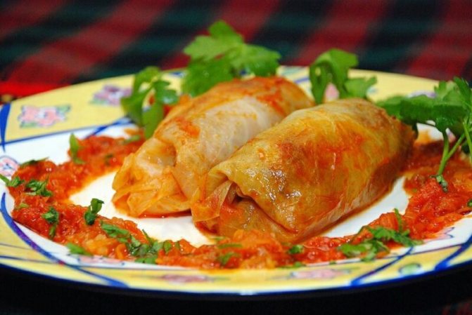 - Формируем из начинки и листьев конверты. Обжариваем каждый на подогретом масле и складываем в жаропрочную посуду. Заливаем закипевшим соусом и убираем в духовой шкаф минут на 40 при 180 градусах. При подаче можно посыпать любой рубленой зеленью.