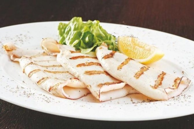 - Разложить филе на решётке, прожарить по 2–3 минуты с каждой стороны. Чем тоньше кальмар, тем меньше времени требуется.