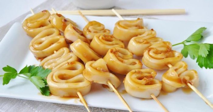 - Когда кальмаров готовят в виде шашлычков, деревянные шпажки перед этим некоторое время держат в чистой воде, чтобы они не начали гореть.