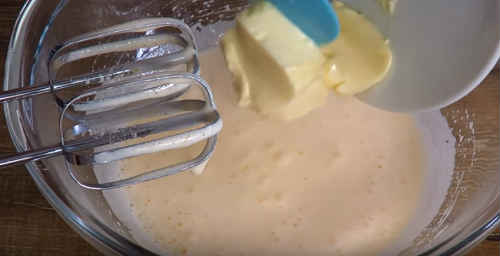 - В миске следует смешать масло с сахаром и яйцами. После массу нужно тщательно взбить миксером до однородности.