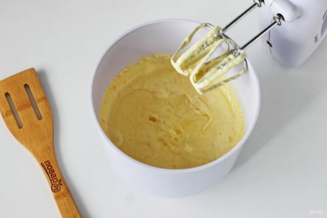 3. Взбиваем миксером на высокой скорости до тех пор, пока масса не побелеет и не загустеет.