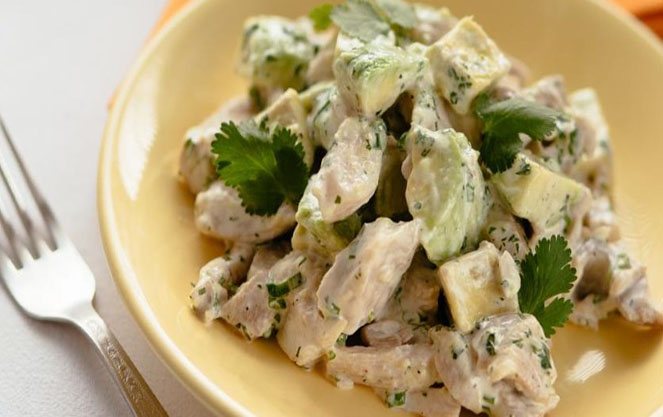 Для украшения салата используют крупно рубленную зелень и тонкие дольки лимона. Если вы принимаете гостей, то подайте его в индивидуальных мисочках, выложив все продукты слоями. Курицу в этом случае следует расположить сверху.