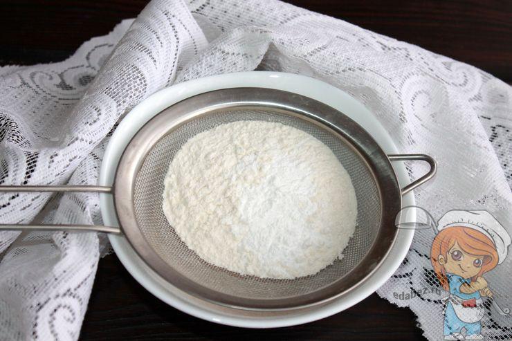 Разрыхлитель соединяем с пшеничной мукой высшего сорта, просеиваем компоненты в миску. Так мы насыщаем сухую смесь кислородом, который подарит выпечке воздушность и пористость. Плюс от мусора и комков избавляемся.