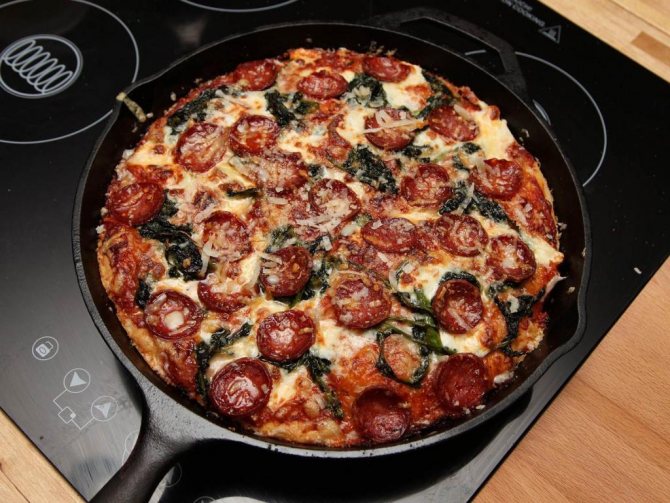 Эта быстрая выпечка без духовки прекрасно выручит даже тех, кто не очень любит готовить. Испечь пиццу по данному рецепту совершенно несложно и времени уйдет очень мало. Если вы все время куда-то спешите, то эта пицца, приготовленная на сковороде — отличный вариант.