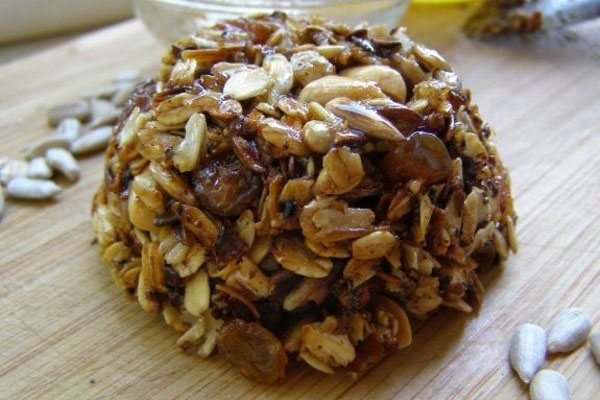 Основа сладости – овсянка, сэр! Вернее, хлопья в количестве 1 стакана. Дополнительно берется ½ ст. любых орехов и столько же изюма (кураги, можно и то, и другое), по 2 ст. л. очищенных семечек и меда. Также потребуется 40 мл оливкового масла.