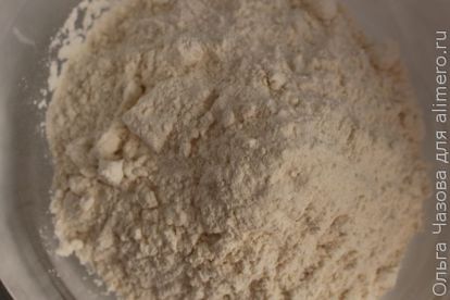 Муку (3,5 стакана) смешать с разрыхлителем и добавить с масляно-молочную смесь. Замесить мягкое тесто. Хочу обратить внимание, муки возможно потребуется от 3,5 до 4 стаканов. Нужном смотреть по консистенции теста. НО! слишком много муки добавлять не следует, что бы не забивать тесто мукой. Затем тесто обернуть пищевой пленкой и отправить в холодильник примерно на 30-40 мин.