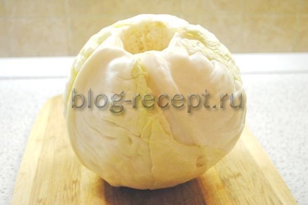 - Для этого варианта требуется тоже вырезать полностью кочерыжку, воткнув острый нож возле ее основания на глубину примерно 2\3 от диаметра кочана и провести им по кругу.