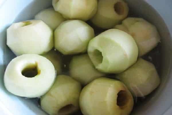 - Затем яблоки повторно погружают в кипящую сладкую жидкость и выдерживают 5 минут.