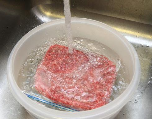 Запакованный фарш помещаем под кран с текущей холодной водой, через 15–20 минут (если кусок не очень большой) мясо готово к использованию. Минус такого способа — качество продукта немного изменится, он станет не таким плотным. Не рекомендуется размораживать фарш под горячей водой, так как в таком случае мясо разморозится неравномерно, а также утратит часть вкуса.