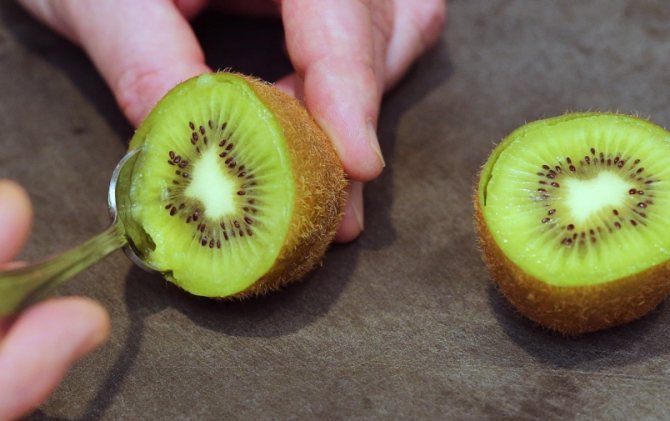 В продаже имеются специальные приспособления для быстрого освобождения таких плодов от кожуры, но очень быстро это можно сделать обычной чайной ложкой. На фотографии выше видно, что киви разрезают сначала пополам, а затем вставляют ложку в промежуток между кожицей и мякотью. Провернув по всему периметру окружности, вынимайте уже очищенную половинку. Процесс занимает всего минуту, поэтому таким методом пользоваться удобнее всего.