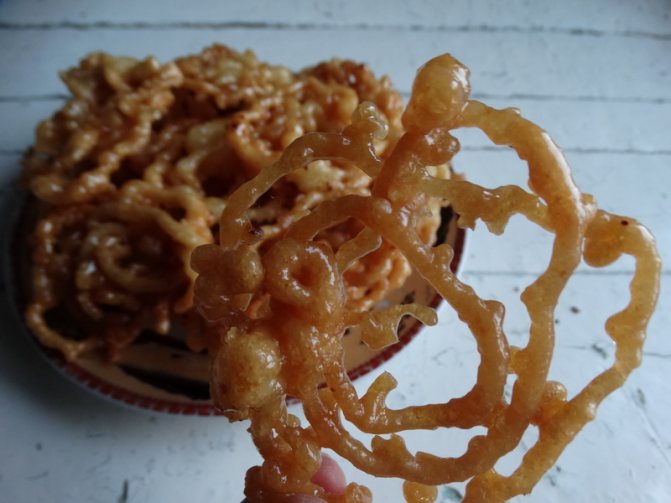 Разогреваем сковороду с растительным маслом и начинаем выдавливать тоненькие спиральки из теста. Масла должно быть достаточно много, спиральки из теста должны плавать в кипящем масле на самой поверхности, ни в коем случае не касаясь дна сковороды. Тесто при жарке необходимо стараться выдавливать как можно быстрее, по началу тесто потонет, но тут же всплывает на поверхность масла.