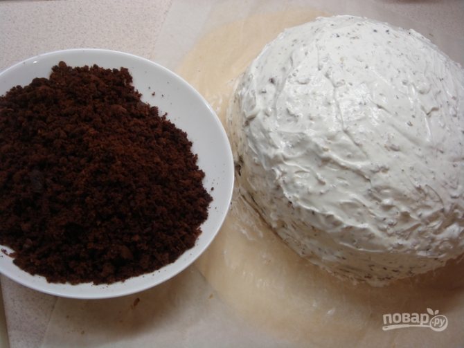 Сверху я распределила оставшийся крем, обмазала бока и обсыпала шоколадной крошкой. Отправила десерт в холодильник на 3 часа (можно держать дольше, тогда пропитается еще лучше).