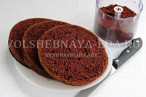 Бисквит я остудила (лучше на решетке, чтобы дно не отсырело), а затем разрезала вдоль на 4 коржа. Удобнее всего подрезать по края хлебным ножом, а затем разрезать с помощью нитки. Верхний корж-купол измельчила в крошку при помощи блендера.