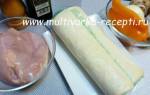 Очищаем овощи. Лук шинкуем тонко, морковку трем на терке. Пассируем овощи на растительном масле. Когда они станут мягкими, выкладываем к ним куриное филе и продолжаем жарить, помешивая, чтобы мясо подрумянилось.