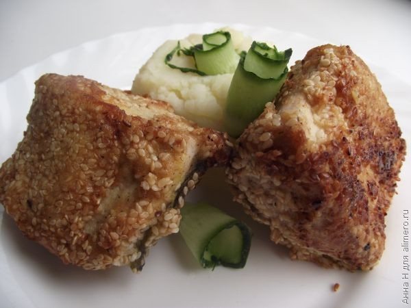 В широкой миске смешиваем крахмал, соевый соус, специи, сахар, имбирь и кунжутное масло. Добавляем мелко нарубленный чеснок. Толстолобика чистим, потрошим и разделываем на небольшие кусочки. Обмакиваем их в смесь из специй и соуса с крахмалом, а затем обваливаем в кунжуте. В сковороде нагреваем растительное масло и выкладываем куски рыбы. Обжариваем их слегка с одной стороны, а затем переворачиваем. Когда и вторая сторона зарумянится, посыпаем толстолобика жареного еще одной ложкой семян кунжута, добавляем остатки маринада и 1 столовую ложку соевого соуса. Обжариваем, перемешивая, еще минуты 2-3, пока соус не испарится полностью. Выкладываем готовую рыбу на тарелки и посыпаем нарезанными перьями зеленого лука.
